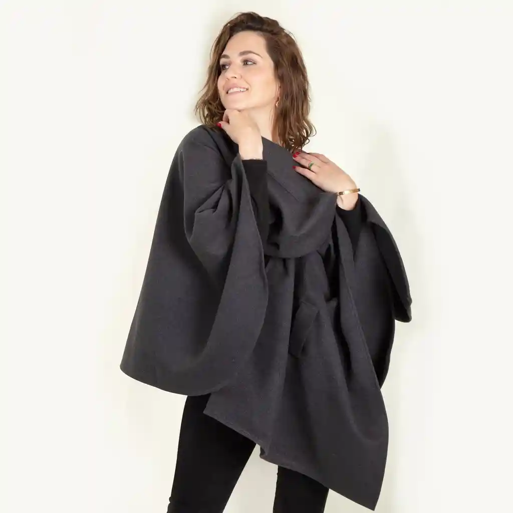 “La capa Olivia es la referencia más vendida de las capas en paño. Es un regalo espectacular porque es talla única y es tan versátil que no te la vas a querer quitar. Además para estar en la casa como es en paño abriga y te sientes arrunchada todo el día. Con el pasador puedes insertar todo un costado y ajustarla. Puedes dejarla tan larga o corta como quieras y también crear looks asimétricos y dejar el pasador en la mitad y pasar un costado sobre el hombro opuesto para que quede más elegante y cortica. No te preocupes que viene con un instructivo para que le saques el mayor provecho posible! Es más pesada y abriga más que la capa Mapa. Recuerda que el paño con el calor corporal va tomando la forma del cuerpo y deja de estar acartonado.”