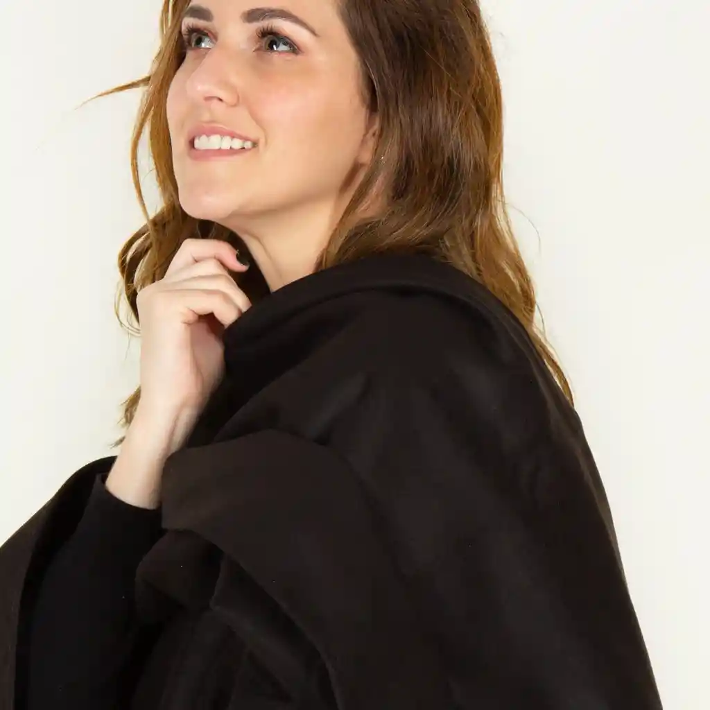 “La capa Olivia es la referencia más vendida de las capas en paño. Es un regalo espectacular porque es talla única y es tan versátil que no te la vas a querer quitar. Además para estar en la casa como es en paño abriga y te sientes arrunchada todo el día. Con el pasador puedes insertar todo un costado y ajustarla. Puedes dejarla tan larga o corta como quieras y también crear looks asimétricos y dejar el pasador en la mitad y pasar un costado sobre el hombro opuesto para que quede más elegante y cortica. No te preocupes que viene con un instructivo para que le saques el mayor provecho posible! Es más pesada y abriga más que la capa Mapa. Recuerda que el paño con el calor corporal va tomando la forma del cuerpo y deja de estar acartonado.”