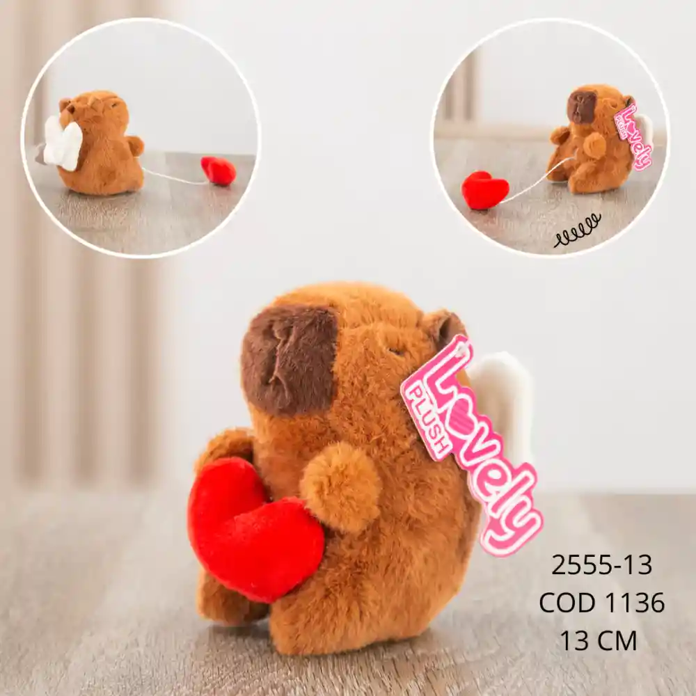 Hermoso peluche de capibara valentín movimiento afelpado de pelo corto. Excelente material y deliciosa fragancia. Tamaño de 13 centímetros.
