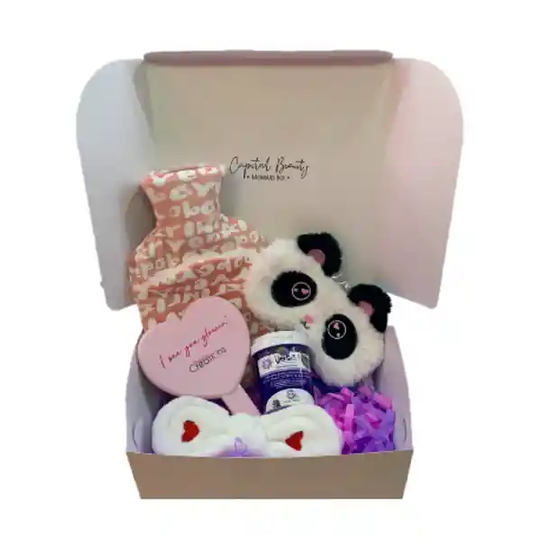 Incluye Antifaz Para Ojos de Peluche y Gel Térmico 1 Und + Bolsa Térmica Grande Para Agua 1 Und + Espejo de Mano Grande 1 Und + Balaca Para Rutina Facial y Mascarilla Yes to 1 Und. Se Entrega en Una Hermosa Caja Decorada Lista Para Entregar.