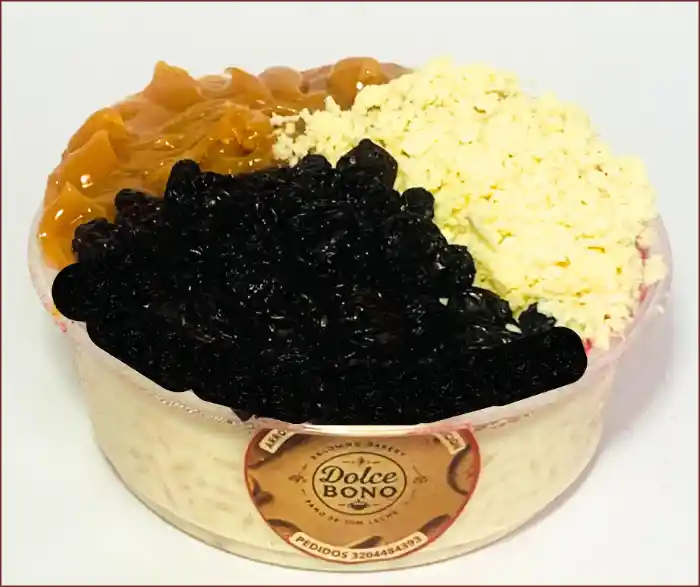 Exquisito y cremosos arroz de leche de la abuela acompañado de queso fresco, uvas pasas y arequipe artesanal