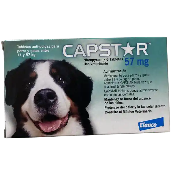 Antiparasitario externo, diseñado para el tratamiento y el control de las infestaciones por pulgas en perros y gatos. Capstar Azul: 11.4 mg comprimidos para perros pequeños y gatos, permite acabar con la infesta de pulgas de tu mascota en solo 30 minutos, ten en cuenta las precauciones especiales para su uso en animales: no usar en animales de menos de 4 semanas de edad o peso inferior a 1 kg.