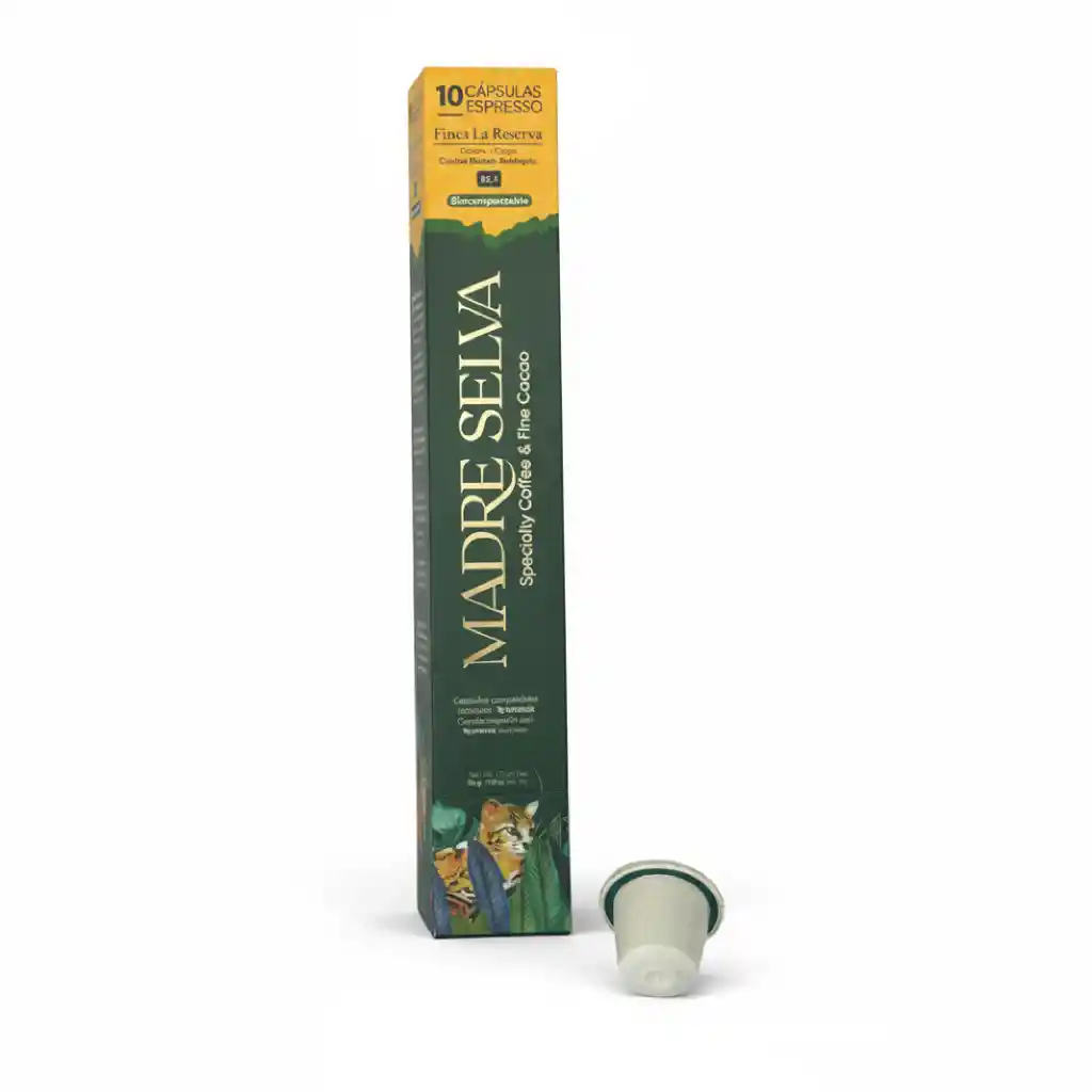 Características del producto • Presentación: caja con 10 cápsulas • Contenido: 5 g de café por cápsula • Peso neto: 56 g • Tipo de café: 100 % arábica de origen colombiano • Compatibilidad: máquinas Nespresso® • Cápsulas biocompostables: se degradan en compostera doméstica en aproximadamente 18 semanas Perfil de taza • Notas a floral, panela, cítrico, durazno y caramelo • Acidez brillante • Textura cremosa • Perfil de café lavado Una forma rápida, práctica y de alta calidad de disfrutar café de especialidad colombiano en cualquier momento del día. Disfruta en casa una verdadera joya del café colombiano con las cápsulas Finca La Reserva de Café Madre Selva, compatibles con máquinas Nespresso®. Este café de especialidad se cultiva a más de 2.000 m s. n. m. en las montañas de Ciudad Bolívar, Antioquia, donde las condiciones naturales permiten desarrollar perfiles complejos y elegantes. Finca La Reserva se caracteriza por un sabor equilibrado, cuerpo medio y una acidez brillante que refleja la riqueza de su origen. Cada grano ha sido cuidadosamente seleccionado y tostado para resaltar su carácter único. Su perfil en taza ofrece notas dulces, florales y ligeramente afrutadas, con un aroma envolvente y un sabor persistente que brindan una experiencia sensorial ideal para los amantes del café premium.