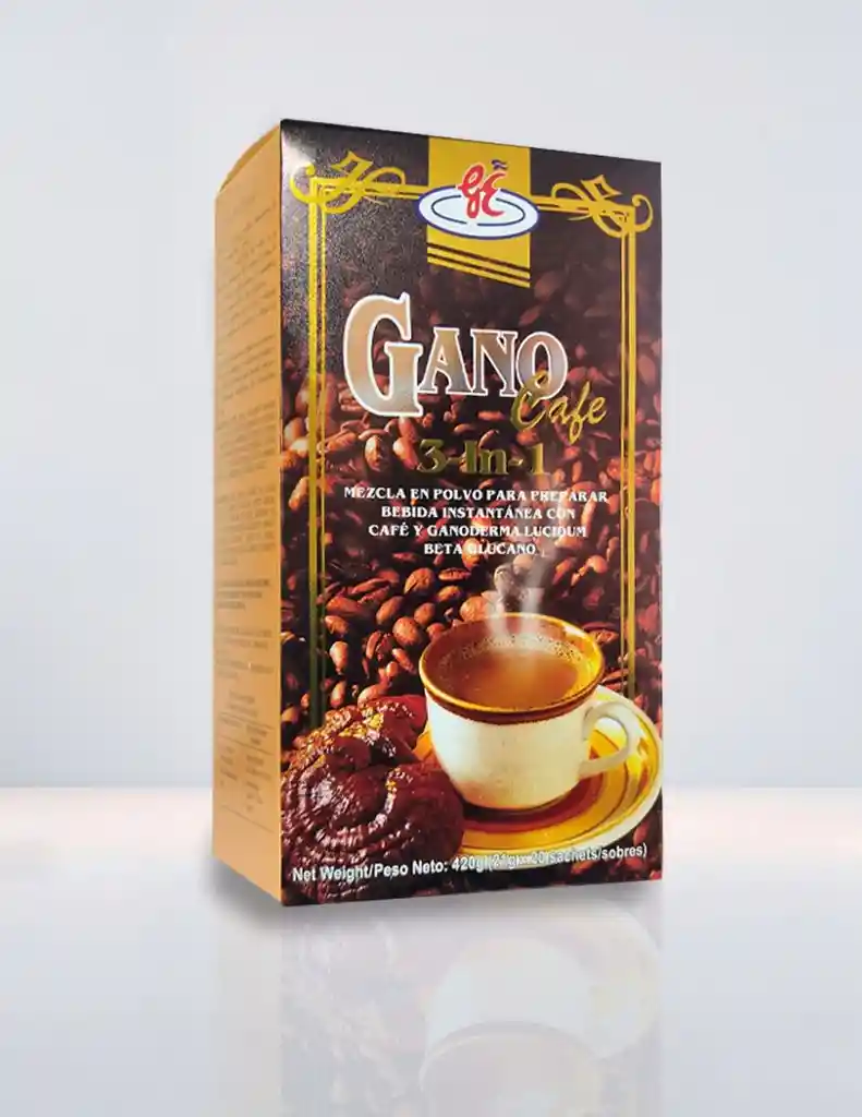 Una fusión de los más selectos granos de café y extracto de Ganoderma Lúcidum, mezclado con café reducido en cafeina . Endulzado con palma de arenga. Posee un sabor especial, con crema no láctea. Da energía y rejuvenece el cuerpo: combate fatiga crónica y mareos. Mejora la respuesta del estado anímico: relaja el sistema nervioso, ayuda a tratar la ansiedad, depresión, insomnio, la tensión nerviosa y la neurosis. Da potencia al sistema inmunológico: promueve el crecimiento y la actividad de las células, mejorando la respuesta a las amenazas. Mejora la circulación sanguínea: ayuda en la presión alta, insuficiencia coronaria, previene la formación de placa de ateroma (grasa en las arterias), previene infartos. Antitumoral: promueve la muerte células cancerígenas, coadyuvante en la quimioterapia para el cáncer. Equilibra colesterol y triglicéridos. Fortalece los huesos: osteoporosis. Protege riñón e hígado: hepatitis, hígado graso, desintoxicación, alcoholismo, cirrosis. Sistema gastrointestinal: colon irritable, gastritis, reflujo. Realiza actividad anti-alergénica: asma, bronquitis, sinusitis, rinitis. Optimiza el uso del oxígeno en el organismo Anti-inflamatorio, anti-viral, anti-bacterial. Registro INVIMA N° RSA-0011698-2021 PRESENTACIÓN 20 sachets