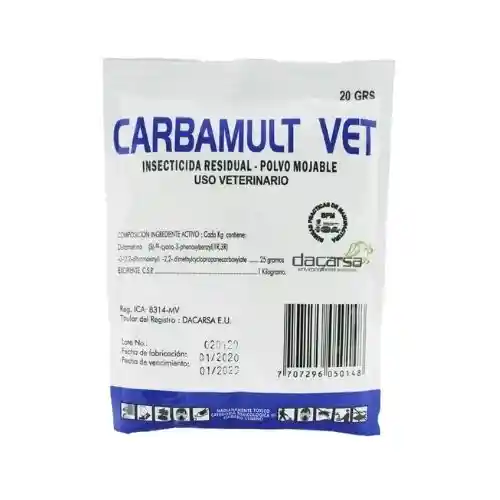 CARBAMULT VET. 20 GR es un insecticida altamente eficaz con Deltametrina, reconocido por su acción residual y avalado por la Organización Mundial de la Salud (OMS). Ofrece una protección útil de hasta 6 meses contra garrapatas, pulgas y otros insectos perjudiciales en la salud pública, veterinaria y agrícola. NDICACIONES: Control de garrapatas Riphicephalus sp., y pulgas de perros Pulex sp., Ctenocephalides sp. En avicultura para el control del escarabajo del estiércol o Alphitobius diaperinus y el ácaro rojo o Dermanyssus gallinae. DOSIS: Para el control de pulgas y garrapatas en perros disuelva 20 gramos en 20 litros de agua bañando bien el perro dejándolo secar posteriormente. Espolvoree 20 gramos en perreras, camas, cobijas, alfombras, pisos y guardaescobas. Para el control del Alphitobius diaperinus mezclar 200 gramos de CARBAMULT VET en 8 litros de agua y aplicar con fumigadora de gota gruesa para una superficie de 200 m2 de galpón, con una residualidad hasta de 6 meses. Para el control de Dermanyssus gallinae, mezclar 10 gramos de CARBAMULT VET por 1 litro de agua y aplicar con fumigadora de gota gruesa.