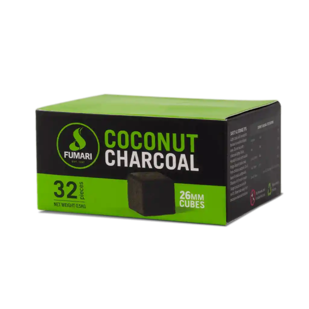 Carbones Fumari a base de coco, 32 cubos de 26 mm cada uno. Garantizan una distribución óptima del calor, producen pocas cenizas y no afectan el sabor de tu esencia. Este producto puede ser utilizado para productos que contienen nicotina o tabaco.. Su uso está dirigido exclusivamente a adultos. No se recomienda para personas no fumadoras, mujeres embarazadas o personas con condiciones médicas sensibles. La venta y consumo están regulados por la Ley 2354 de 2024.