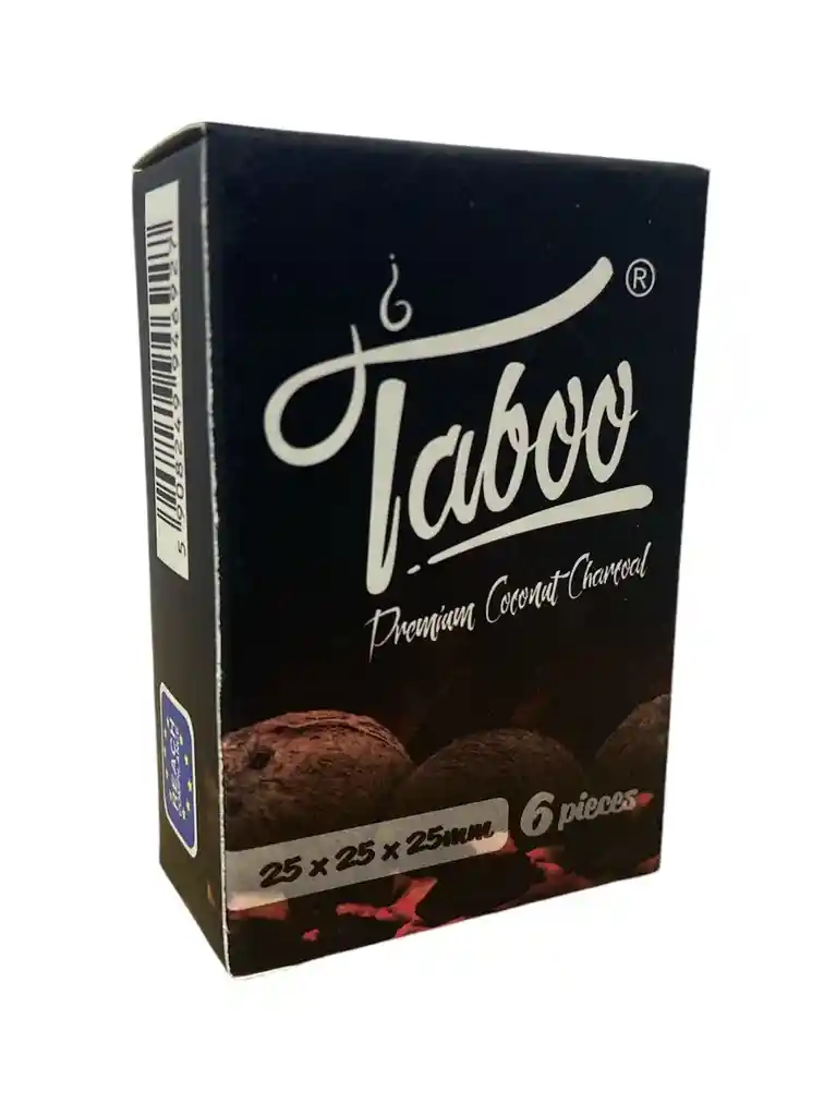 Carbones Taboo a base de coco, 6 cubos de 25 mm cada uno. Garantizan una distribución óptima del calor, producen pocas cenizas y no afectan el sabor de tu esencia. Carbon para Hookah, Shisha, Narguile, Arguile. Este producto puede ser utilizado para productos que contienen nicotina o tabaco. Su uso está dirigido exclusivamente a adultos. No se recomienda para personas no fumadoras, mujeres embarazadas o personas con condiciones médicas sensibles. La venta y consumo están regulados por la Ley 2354 de 2024.