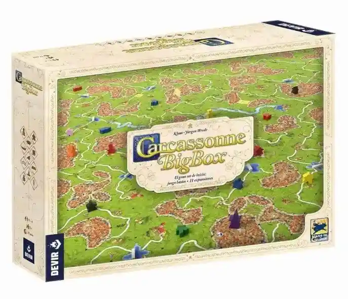 La caja contiene el juego básico y 11 expansiones Ambientado en la ciudad medieval amurallada francesa de Carcasona, el juego consiste en crear un mapa de juego donde los jugadores compiten por hacer el máximo número de puntos con las mejores posesiones (ciudades, praderas, caminos y monasterios) del mapa. La estrategia individual es básica para ganar cada partida. Idioma: Español, Edad: 7+, Tiempo de Juego: 350 min aprox, Jugadores: 2-6