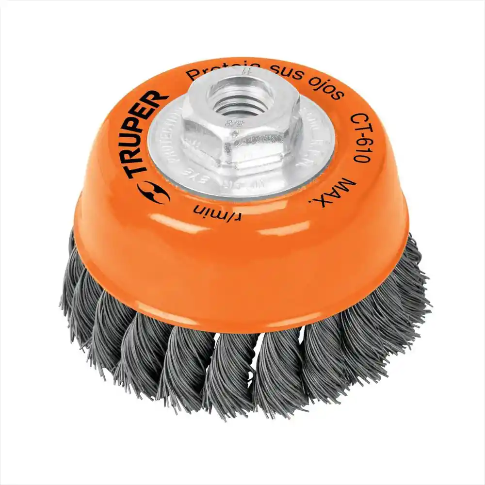 Para Usarse Con Esmeriladoras. Alambre de Acero al Alto Carbono. Cerdas Medianas. Para Preparación y Limpieza de Superficies Metálicas, Limpieza de Soldaduras, Remoción de Sarro, Óxido, Corrosión, Etcétera. Espesor: 15 mm. Calibre: 0.35 mm. Largo Del Alambre: 18 mm. Velocidad Máx: 12000 Rpm. Truper, Ferretería