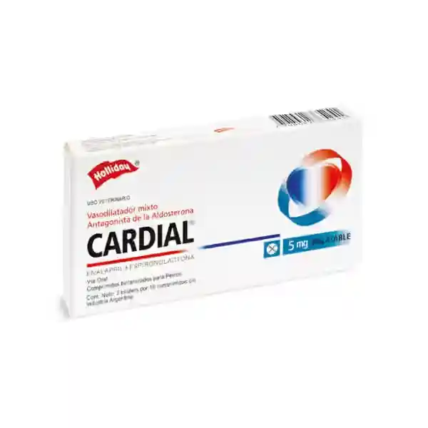 Cardial 5 mg es un medicamento veterinario para perros indicado como soporte en la insuficiencia cardíaca asociada a insuficiencia valvular o cardiomiopatía dilatada. Su combinación de enalapril (vasodilatador) y espironolactona ayuda a reducir la carga de trabajo del corazón y a brindar protección frente a los efectos de la aldosterona. Usar bajo prescripción y seguimiento del médico veterinario. Ayuda a mejorar la función cardíaca en perros con insuficiencia cardíaca Aporta acción vasodilatadora y soporte cardioprotector Contribuye a contrarrestar los efectos de la aldosterona Presentación en tabletas para administración oral
