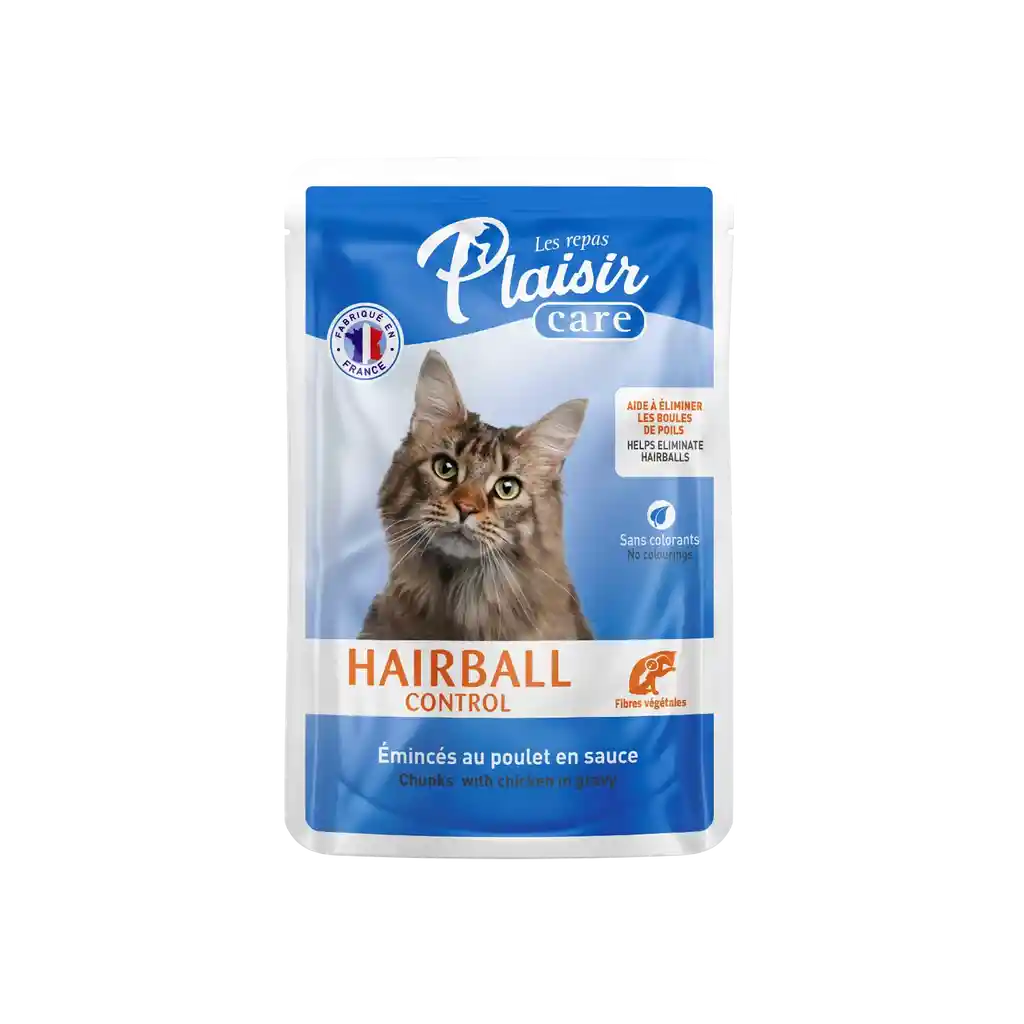 ¡Nueva fórmula mejorada! Con un 20% más de ingredientes frescos y sin colorantes, esta golosina Les Repas Plaisir CARE Hairball ha sido especialmente formulada para ayudar a tu gato a eliminar las bolas de pelo. Enriquecida con fibras y aceite de salmón, esta deliciosa opción contribuye al bienestar digestivo de tu felino. Disponible en bolsa individual de 80g.