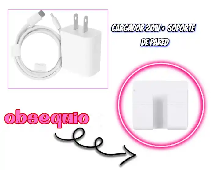Carga tu iPhone de manera rápida y eficiente con el Cargador iPhone 20w Carga Rápida + Cable. Este cargador es perfecto para: Usuarios de iPhone que buscan una forma rápida y conveniente de cargar su dispositivo. Personas que viajan con frecuencia y necesitan un cargador compacto y portátil. Propietarios de iPad y otros dispositivos Apple que también se pueden cargar con USB-C. Características: Potencia de 20 vatios: Proporciona una carga rápida para tu iPhone, lo que te permite ahorrar tiempo. Compatible con carga rápida: Funciona con iPhones compatibles con carga rápida, como el iPhone 8 o posterior. Cable Tipo-C a Lightning incluido: Un cable de alta calidad para cargar tu iPhone de forma segura y confiable. Diseño compacto y portátil: Fácil de llevar en tu bolso o mochila. Durable y confiable: Fabricado con materiales de alta calidad para un uso duradero. Con este cargador, puedes estar seguro de que tu iPhone estará siempre cargado y listo para usar cuando lo necesites. Obsequio Soporte De Pared Para Celular: Montaje universal: Compatible con la mayoría de los smartphones. Posición ajustable: Coloca tu teléfono en el ángulo que prefieras para una visualización cómoda. Ideal para el hogar o la oficina: Mantén tu celular siempre a la vista y al alcance de tu mano. Diseño elegante y minimalista: Combina a la perfección con cualquier decoración. Juntos, te brindan: Carga rápida y segura: Carga tu iPhone de forma rápida y eficiente sin preocuparte por daños a tu dispositivo. Comodidad y practicidad: Disfruta de tener tu celular siempre a la vista y al alcance de tu mano, ya sea en casa, en la oficina o en cualquier otro lugar. El combo perfecto para usuarios de iPhone: Un regalo ideal para cualquier persona que tenga un iPhone y busque una solución de carga rápida y práctica.