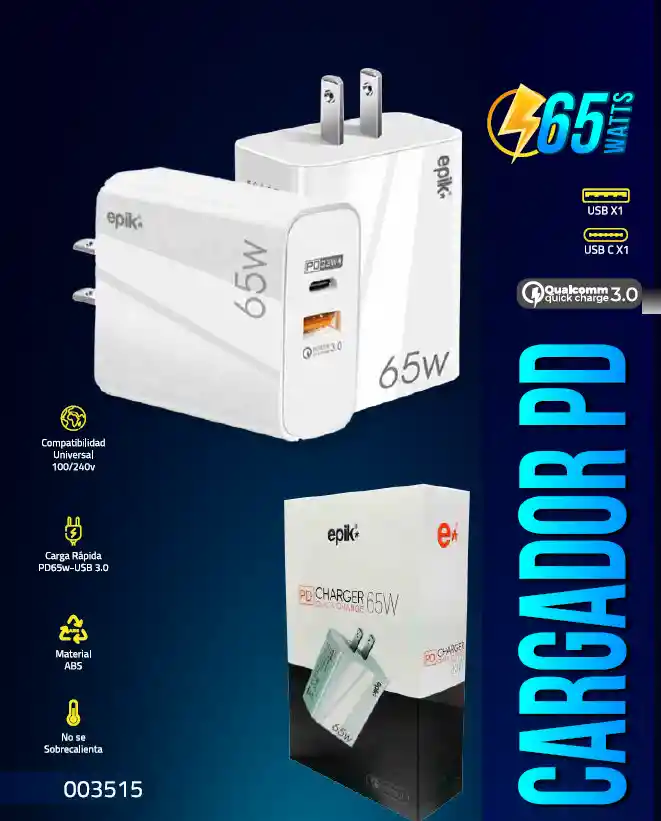 Acelera la carga de tus dispositivos al máximo con el Cargador 65W de Carga Super Rápida Inteligente de Dos Puertos Original EPIK. Este cargador inteligente es la solución perfecta para aquellos que buscan cargar sus dispositivos de manera eficiente y rápida. Con una potencia de 65W, es capaz de cargar tus dispositivos hasta un 70% más rápido que los cargadores convencionales, lo que te permite ahorrar tiempo valioso. El Cargador 65W de Carga Super Rápida Inteligente de Dos Puertos Original EPIK cuenta con dos puertos USB, lo que te permite cargar dos dispositivos simultáneamente sin comprometer la velocidad de carga. Ya sea tu teléfono inteligente, tableta, auriculares u otros dispositivos compatibles, este cargador se adapta a tus necesidades. Además de su carga rápida, este cargador inteligente está equipado con tecnología de carga inteligente, que detecta automáticamente los dispositivos conectados y proporciona la cantidad óptima de energía para una carga segura y eficiente. No tendrás que preocuparte por dañar tus dispositivos, ya que este cargador está diseñado para protegerlos contra sobrecargas, sobrecalentamientos y cortocircuitos. El diseño compacto y portátil del Cargador 65W de Carga Super Rápida Inteligente de Dos Puertos Original EPIK lo hace perfecto para llevarlo contigo a donde quiera que vayas. Ya sea en casa, en la oficina o de viaje, siempre tendrás la capacidad de cargar tus dispositivos de manera rápida y conveniente. No pierdas más tiempo esperando a que tus dispositivos se carguen lentamente. Obtén ahora el Cargador 65W de Carga Super Rápida Inteligente de Dos Puertos Original EPIK y experimenta la velocidad y eficiencia en la carga de tus dispositivos. ¡No esperes más! Adquiere el Cargador 65W de Carga Super Rápida Inteligente de Dos Puertos Original EPIK y disfruta de una carga rápida y segura para todos tus dispositivos. Simplifica tu vida diaria y aprovecha al máximo tu tiempo con este cargador de calidad superior.