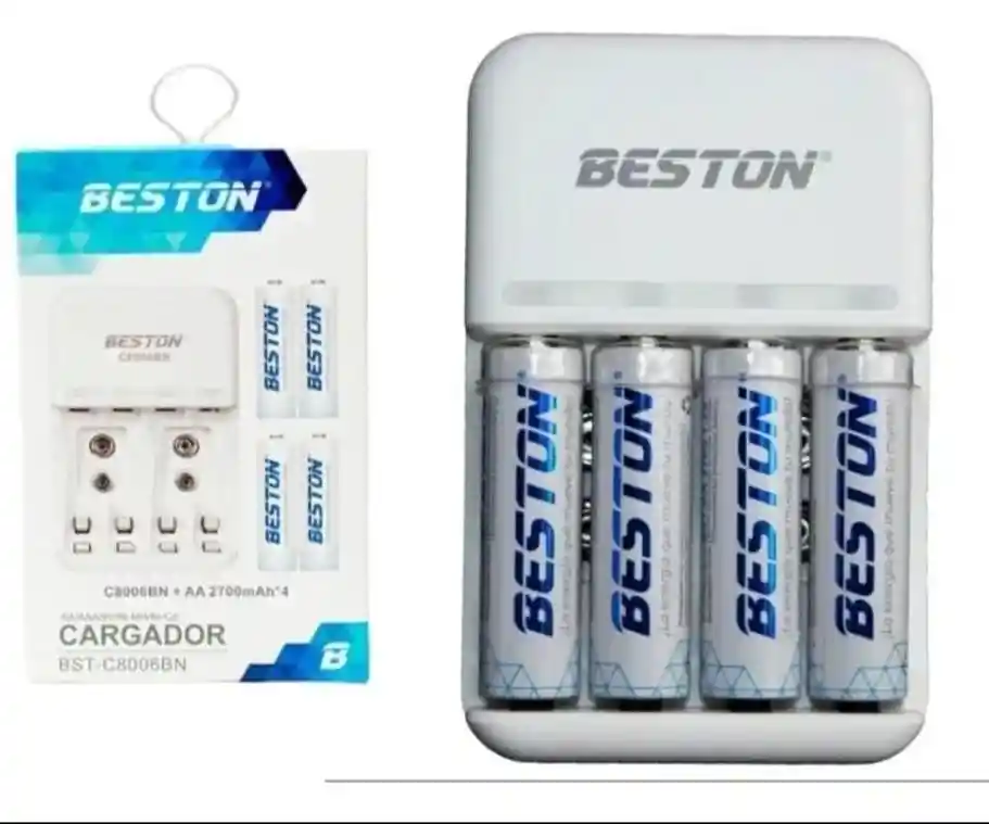 El Paquete Contiene: 4 pilas AA Cargador Beston BST-C8006B Este cargador puede cargar 4 baterías recargables AA/AAA Ni-MH o Ni-Cd simultáneamente. Cuenta con un LED que se ilumina mientras el cargador está en uso. Incluye protección de temperatura: se activa cuando la temperatura supera los 60°C. Si el cargador o las baterías se sobrecalientan durante la carga, la carga se detiene automáticamente por seguridad. ★ Cargador Pilas AA/AAA + X4 Baterías Mixtas AA &AAA Recargables Beston C8006B/C8006 ★ ★ Cargador de pilas para AA/AAA: Recarga tus pilas AA y AAA de forma rápida y conveniente con este cargador. ★ 4 baterías mixtas recargables: El kit incluye 2 baterías AA y 2 baterías AAA recargables Beston C8006B/C8006 de alta capacidad. ★ Energía confiable: Disfruta de un rendimiento confiable en tus dispositivos electrónicos con estas baterías recargables. ★ Ahorro y sostenibilidad: Al utilizar pilas recargables, ahorras dinero y reduces el desperdicio de pilas desechables. ★ Versatilidad: Ideal para una amplia gama de dispositivos como controles remotos, juguetes y más