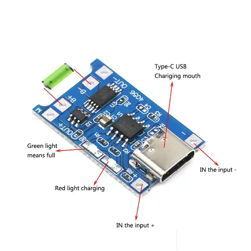 El voltaje de entrada: 4.35-6 V (voltaje recomendado 5 v) Voltaje de corte de carga: 4.2 V + / - 1% Salida de corriente de carga maxima: 1000 mA El voltaje de proteccion de sobrecarga de la bateria: 4.28 V Tension de elevacion de sobrecarga de la bateria: 4.00 V El voltaje de proteccion de descarga de la bateria: 3.0 V Voltaje de terminacion de descarga de la bateria: 3.2 V Bateria: corriente de proteccion contra sobrecorriente 3 A El tamaño del tablero: aproximadamente 2.5 * 1.65 cm Estado de la luz: sin carga, la luz no es brillante, la luz roja para recargar, esta llena de luz verde. LA COMPRA INCLUYE: 1X CARGADOR BATERIA TP4056 18650 TIPO C CON PROTECCION