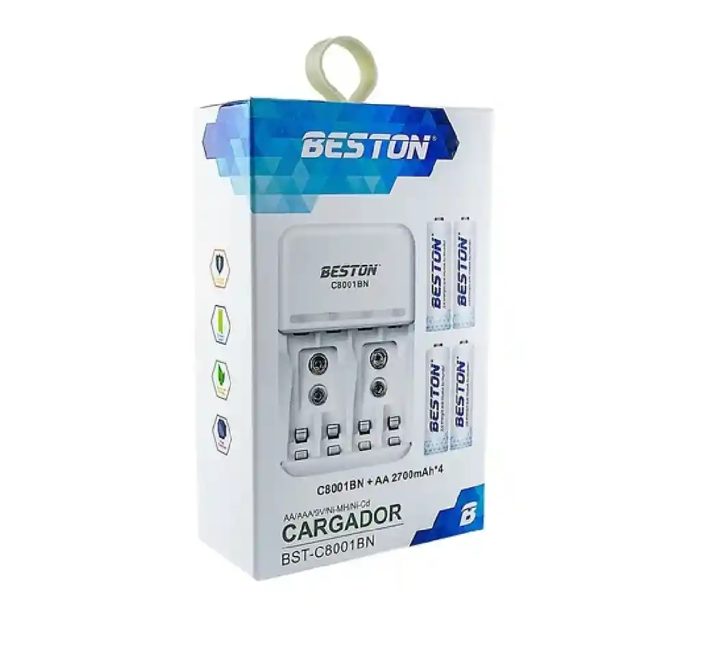 PAQUETE CONTIENE: 1 CARGADOR MARCA BESTON 4 BATERÍAS AA 2700 mAh MARCA BESTON 1 CAJA CARGADOR BST-C8001BN CARACTERÍSTICAS DEL PRODUCTO: -Incluye 4 baterías AA de 2700mAh MARCA BESTON. -Carga 4 baterías recargables AA/9V/AAA Ni-MH o Ni-Cd DE CUALQUIER MARCA. -Luz LED encendida para cargar, NO SE APAGARA cuando las baterías estén completamente cargadas. –Protección de temperatura: se prende cuando la temperatura está por encima de 60°C. Si el cargador o las baterías están recalentadas durante la carga, se detendrá la carga automáticamente por seguridad. –Protección de la sobre intensidad de corriente: con el modo de corriente constante, cualquier influencia negativa de baterías causada por fluctuaciones de corriente se puede evitar. – Autoidentificación: reconoce las baterías no recargables, los cortocircuitos y las baterías defectuosas, mediante su microprocesador; además tiene protección del cortocircuito. –Función de Restauración: Restaura la batería si el voltaje de la batería es extremadamente bajo (ej: 0-0.9V). PRECAUCIÓN: -El cargador no cargará baterías si están colocadas en la polaridad incorrecta. -No arroje ni coloque objetos pesados sobre el cargador. -Los niños deben usarlo bajo supervisión de un adulto. -Use en temperaturas entre 0°C – 40°C -No lo exponga a altas temperaturas, ni lo arroje al fuego ni al agua. ESPECIFICACIONES: Peso: 175g. Tamaño: 99.5 x 66 x 26 mm. Entrada: 100-240V AC 50/60 Hz. Salida: 9V x 2 35 mAh. AA x 2 200 mAh AA x 4 200 mAh. AAA x 2 100 m A h AAA x 4 100 mAh. MODO DE USO: * Descargue por completo las baterías una vez abra el producto. * La primera carga es de 12 horas. * De la segunda carga en adelante son 8 horas. * Único tiempo estimado de carga.