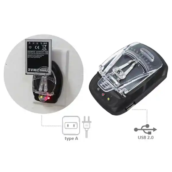 ● Compatible con baterías de teléfonos móviles, PDA, ● Cámaras digitales y videocámaras digitales con una salida de menos de 4,3 V o menos de 2000 mAh de capacidad ● Potencia de entrada: 100 – 240 V 50/60 Hz; enchufar. ● Corriente de salida: 200 mAh ± 50 mAh ● Indicadores LED: confirmación de polaridad, indicador de carga, indicador de batería llena ● .Detecta automáticamente los contactos de polaridad positiva/negativa para un funcionamiento seguro y sencillo ● El clip de bisagra con resorte mantiene la batería en su lugar mientras se carga cargado