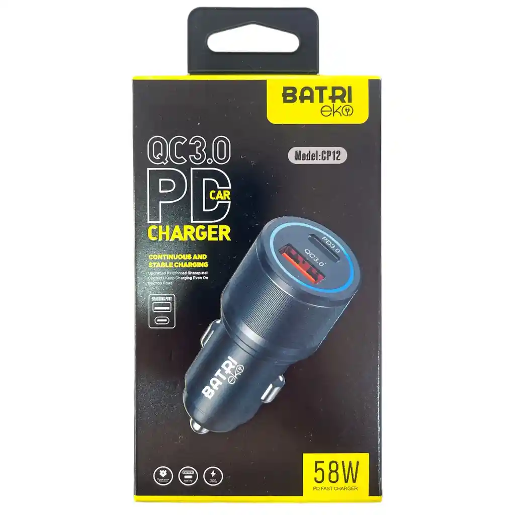 Cargador de carro marca BATRI. Carga rápida PD3.0 TIPO C QC3.0 USB