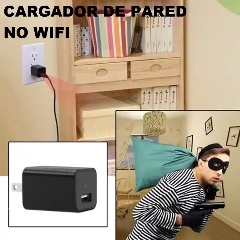 CARGADOR DE PARED CON CAMARA ESPIA-NO WIFI.DISPONIBILIDAD PARA ENTREGA INMEDIATA.CARACTERISTICAS GENERALES DEL PRODUCTO.• PRODUCTO EXCLUSIVO DE EXCELENTE CALIDAD.• PRODUCTO IMPORTADO 100% ORIGINAL.• CAMARA ESPECIAL PARA ESPIONAJE.• GRABA SOLO ESTANDO CONECTADA A LA CORRIENTE 110V.• SIRVE COMO CARGADOR DE CELULARES O EQUIPOS QUE TRABAJEN CON 5V.• CAMARA INDISCRETA, PUEDE SER OCULTADA EN UN TOMA-CORRIENTE Y GRABAR CONECTADO.• PUEDE GRABAR SUS VIDEOS MIENTRAS ESTA CARGANDO SUS EQUIPOS EJ. CELULARES.• POSEE SENSOR DE MOVIMIENTO.• POSEE GRABACION DE VIDEO CICLICAMENTE PARA MAYOR COBERTURA DE TIEMPO DE GRABACION .• PUEDE VER LOS VIDEOS DESPUES DE GRABADOS EN EL COMPUTADOR.• RECIBE MEMORIAS MICRO SD HASTA 32GB (NO INCLUIDA).• FORMATO DE VIDEO: AVI.• RESOLUCION DE VIDEO: HD.• ANGULO: 75 GRADOS.• PESO 50 Gm.• COLOR: NEGRO.• TAMAÑO: 4.2 CM X 5.0 CM X 2,5 CM.• NO POSEE BATERIA, DEBE DE ESTAR CONECTADA A LA ELECTRICIDAD.CONTENIDO DEL PAQUETE:• 01. CARGADOR DE PARED ESPIA NO WIFI.• 01. CABLE USB.• 01. MANUAL DE INSTRUCCIONES.• 01. MANUAL BASICO EN ESPAÑOL.NOTA: NO INCLUYE LA MEMORIA MICRO SD.
