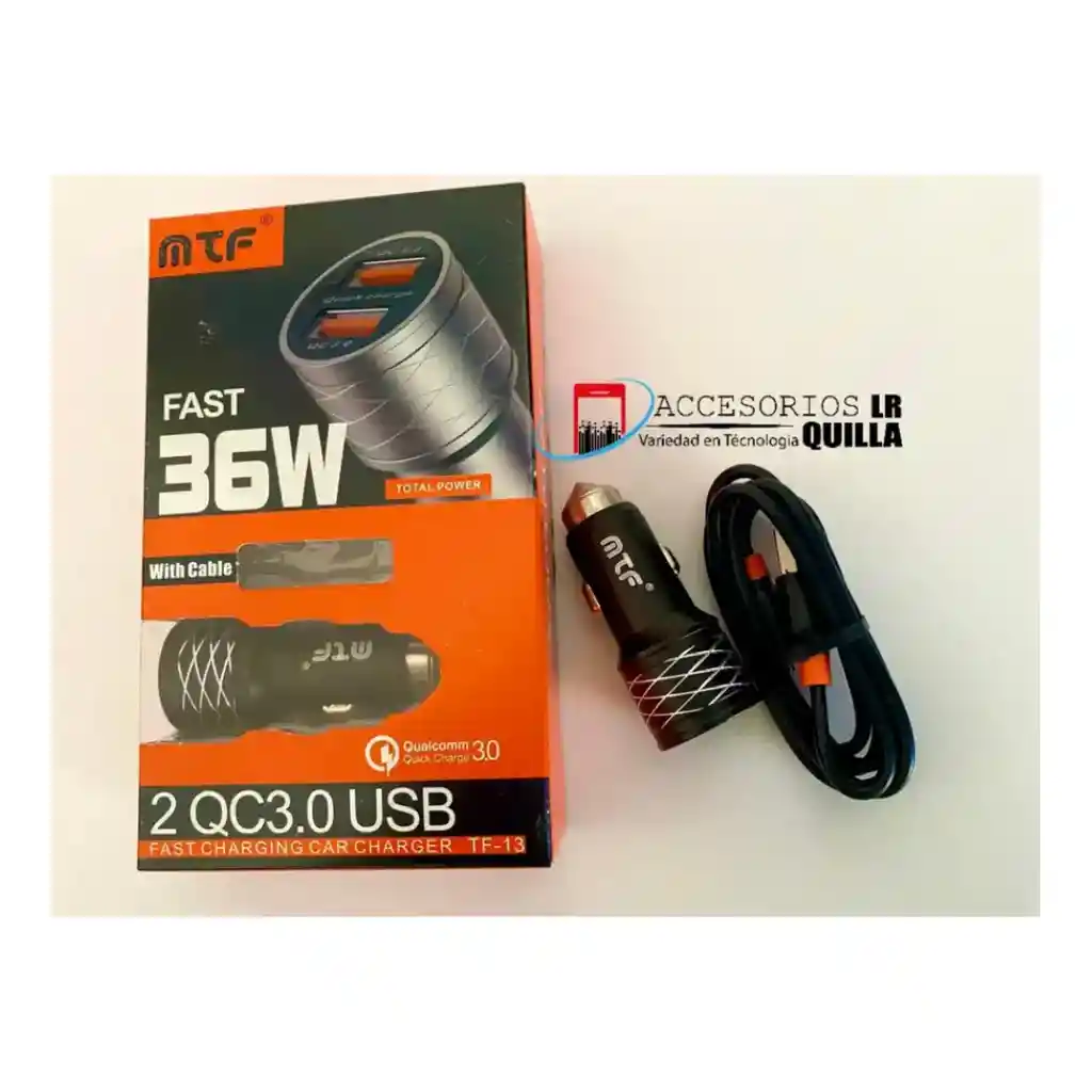 CARGA RAPIDA. Carga tu celular desde tu coche. Marca MTF Ref: TF-13 Contiene 2 puertos USB, cada uno cuenta con qualcomm 3.0 USB1 SALIDA: 5W/3A 9V/2A 12W/1.5A USB2 SALIDA: 5V/3A 9V/2A 12W/1.5A Úselo solo en el enchufe del encendedor de cigarrillos del automóvil. Mantener y usar en un lugar seco. Desenchufe el cargador cuando no esté en uso.