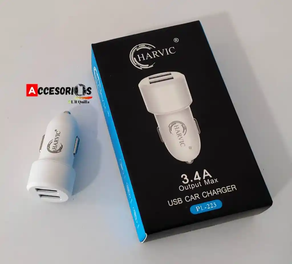 Cargador carga rápida de celular para AUTOS. Cuenta con doble puerto USB Marca: Harvic Potencia: 3.4 amperios No incluye cable de carga.