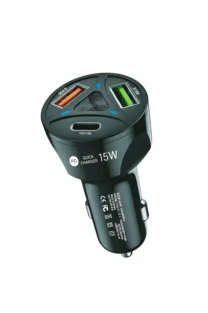 Input: 12V-24V 0.5A Output: 5V-3.0A 15W Protección contra corto circuito y sobrecargas Dos puertos para diferentes dispositivos USB A USB C Qualcomm Quick Charger 3.0