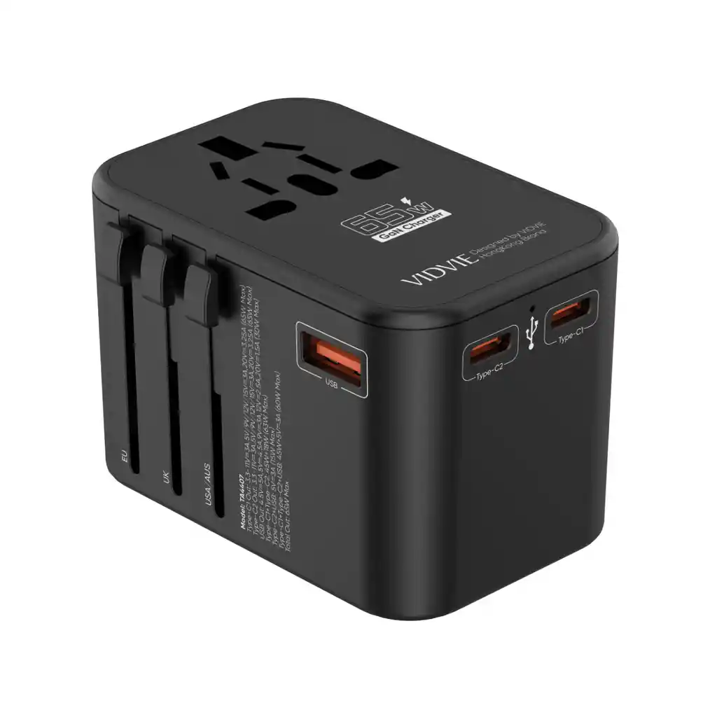 El VIDVIE TA4407 es un cargador universal de conversión global, diseñado para ofrecer la máxima comodidad al viajar o trabajar con diferentes dispositivos en cualquier parte del mundo. Fabricado con polímero y vinil comprimido retardante de llama de alta calidad, garantiza seguridad, resistencia y un uso confiable en todo momento. Con salida total de hasta 65 W, es capaz de cargar de forma rápida y eficiente múltiples equipos de manera simultánea. Incorpora dos puertos USB-C y un puerto USB-A, compatibles con diversos protocolos de carga rápida, lo que lo convierte en una solución versátil para smartphones, tablets, laptops y otros dispositivos electrónicos. Características -Cargador de conversión universal para uso global. -Fabricado en polímero y vinil comprimido retardante de llama de alta calidad. -Salida máxima de 65 W para carga rápida y eficiente. -2 puertos USB-C y 1 puerto USB-A para conexión simultánea. -Compatible con smartphones, tablets, laptops y más. -Diseño de bloqueo de seguridad lateral para mayor estabilidad. -Ideal para viajes y uso en diferentes países. Especificaciones -Modelo: TA4407 -Marca: VIDVIE -Tipo: Cargador de conversión universal global -Material: Polímero + vinil comprimido retardante de llama -Puertos: 2 × USB-C + 1 × USB-A -Potencia máxima: 65 W -Salidas *USB-C1: 3,3-11V/3A, 5V/9V/12V/15V/3A, 20V/3,25A (65W máx.) *USB-C2: 3,3-11V/3A, 5V/9V/12V/15V/3A, 20V/3,25A (65W máx.) *USB-A: 4,5V/5A, 5V/4,5A, 9V/3A, 12V/2,5A, 20V/1,5A (30W máx.) -Combinaciones *USB-C1 + USB-C2: 45W + 18W (63W máx.) *USB-C2 + USB-A: 5V/3A (15W máx.) *USB-C1 + USB-C2 + USB-A: 45W + 5V/3A (60W máx.) -Salida total: 65 W