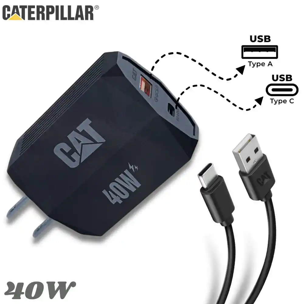 Cargador De Pared Tipo C Carga Rapida 40w Caterpillar generico. Optimiza tu tiempo y mantén tus dispositivos siempre listos con el Cargador de Pared de Carga Rápida de 40W. Está diseñado para brindarte una carga eficiente y segura, ideal para usuarios que necesitan energía rápida para su día a día. Características: - Carga Rápida (40W): Su tecnología de 40 Watts permite cargar la batería de tu celular en una fracción del tiempo comparado con los cargadores convencionales, reduciendo las horas de espera. - Compatibilidad Universal Tipo-C: Es totalmente compatible con cualquier smartphone, tablet o accesorio que utilice un puerto de carga USB-C. - Diseño Compacto y Ligero: Su estructura de clavija plana ocupa muy poco espacio, ideal para enchufes múltiples o para llevar en el bolso. - Doble Puerto Usb y Usb Tipo C: Ideal para cargar 2 dispositivos al tiempo, cada uno con una potencia de máxima rapidez. Especificaciones: - Tipo de producto: Adaptador de corriente de pared + Cable de datos/carga. - Potencia máxima: 40W. - Interfaz del cable: USB a USB Tipo-C.