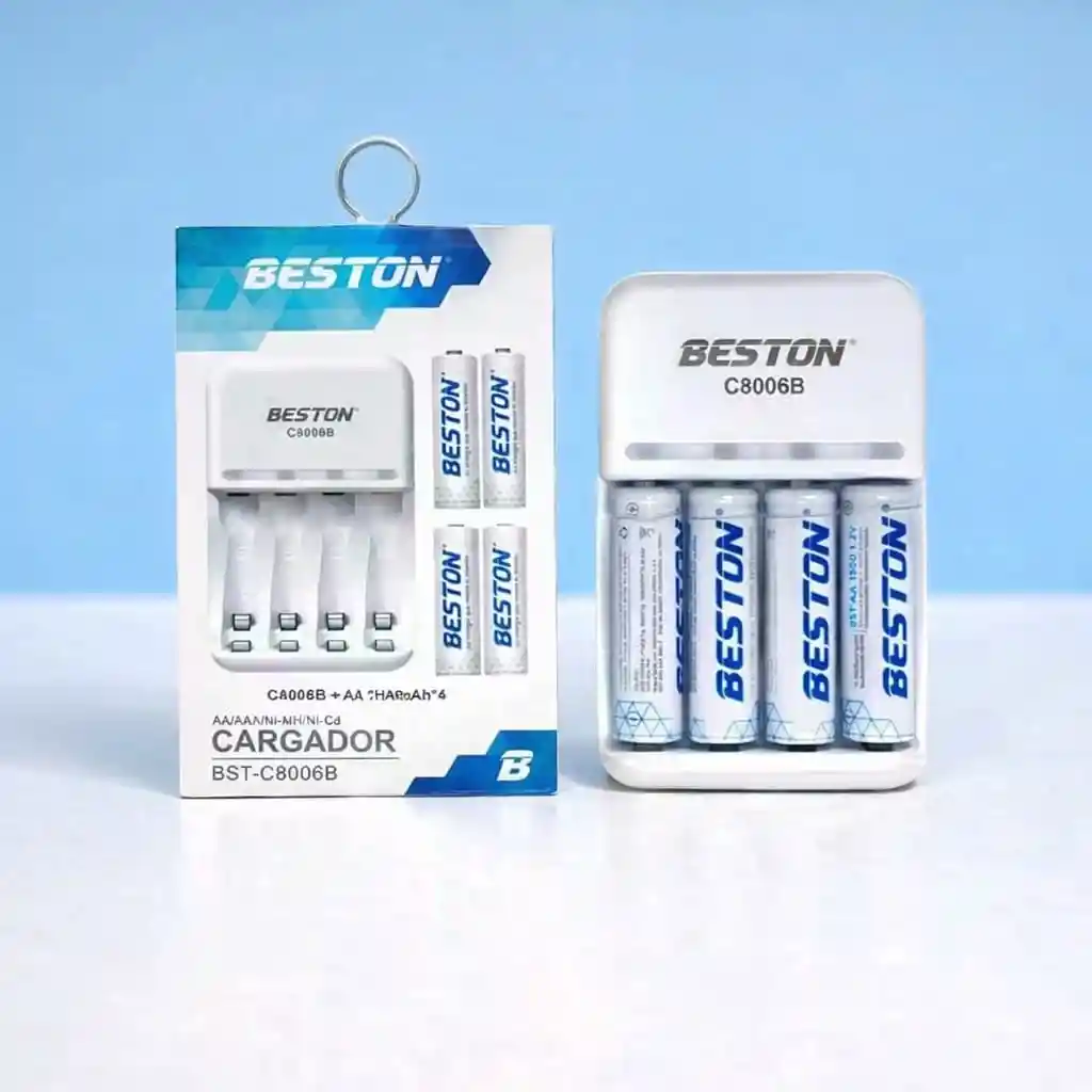 Descripción: ✓Ahorra dinero y energía con baterías recargables de alto rendimiento El cargador BESTON C8006B incluye 4 baterías AA recargables de 1500mAh, ideal para uso diario en controles, juguetes, cámaras y más. Características principales: ✔️ Incluye 4 baterías AA recargables de 1500mAh ✔️ Cargador con capacidad para AA y AAA ✔️ Conexión USB (fácil de usar en múltiples dispositivos) ✔️ Indicador de carga LED ✔️ Diseño compacto y portátil ✔️ Ideal para uso en hogar, oficina o viajes