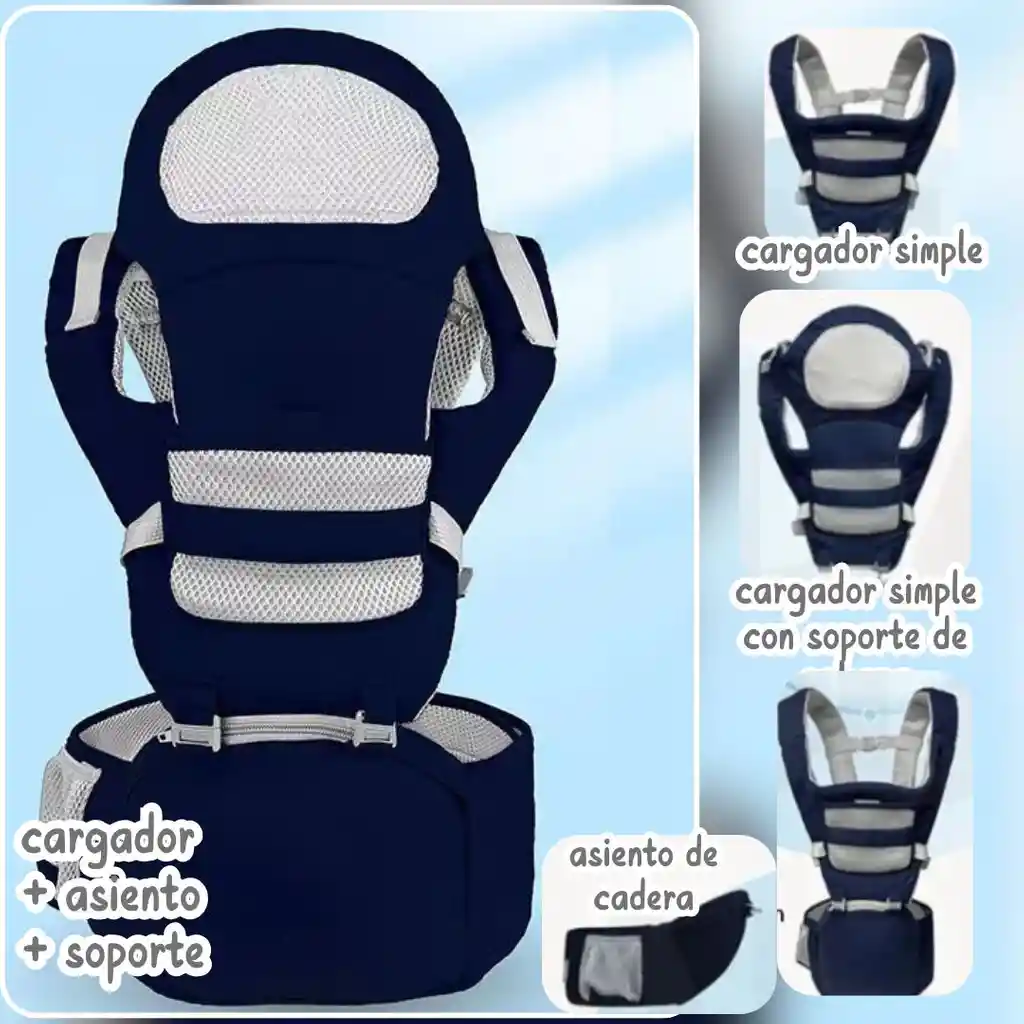 Características destacadas: Color: azul oscuro, rosado, celeste y gris Apto desde el nacimiento hasta los 48 meses. Soporta hasta 20 kilogramos de peso. Diferentes de uso para adaptarse a cada etapa del crecimiento del bebé. Panel trasero largo y rígido que protege la columna vertebral del bebé. Diseño ergonómico que distribuye el peso de forma adecuada, sin causar presión ni incomodidad. Tejido de alta calidad, fuerte, seguro y con excelente ventilación. No genera calor excesivo ni humedad, ideal para climas cálidos. Almohadilla antifricción suave y delicada con la piel del bebé. Compatible con cinturas de 85 a 118 cm. Cierres resistentes y duraderos para un ajuste seguro. Incluye bolsillos laterales