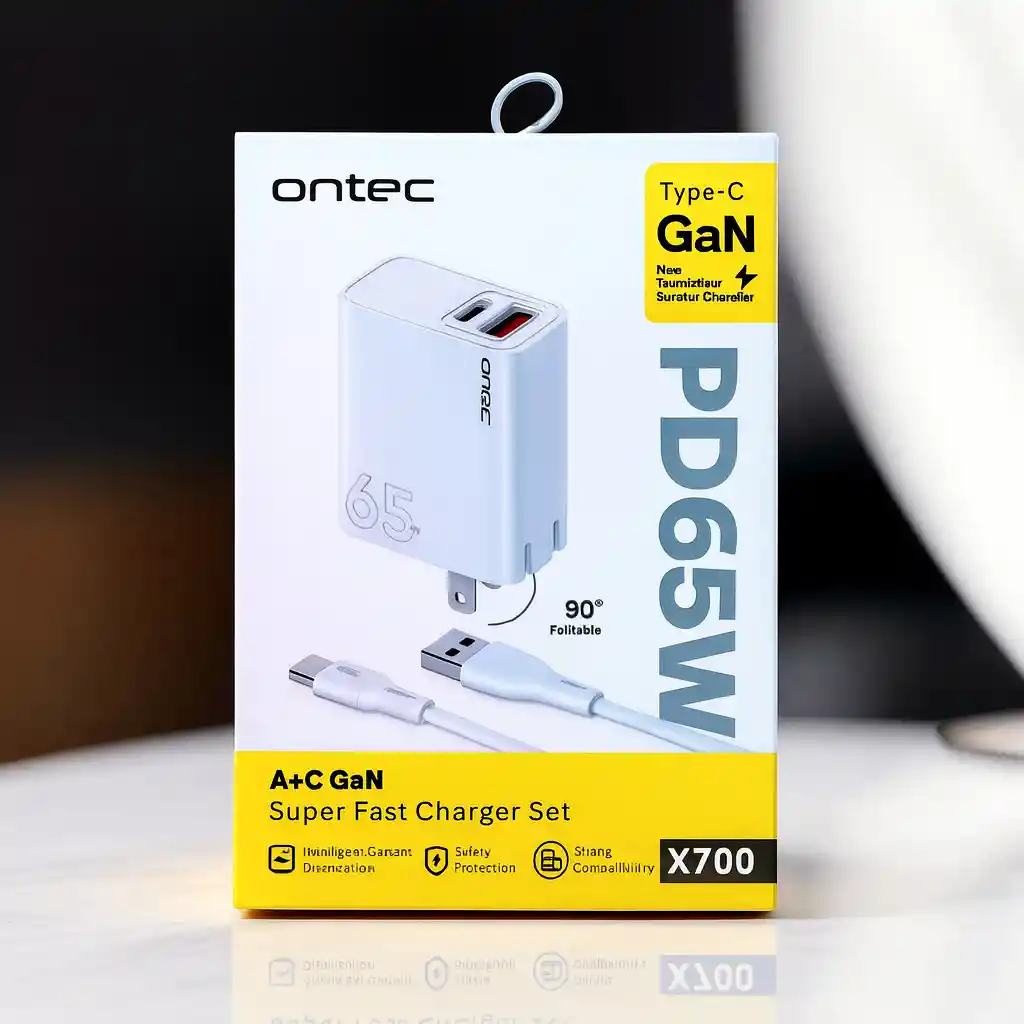 Este es un juego de cargador súper rápido Ontec PD65W GaN que utiliza tecnología de nitruro de galio (GaN) para una carga eficiente. Potencia de salida de 65W: Permite la carga rápida de múltiples dispositivos, como teléfonos y portátiles ligeros. Tecnología GaN: Utiliza nitruro de galio en lugar de silicio para el circuito de alimentación, resultando en un cargador más compacto y eficiente. Puertos duales (A+C): Cuenta con dos puertos USB, USB-A (QC 3.0) y USB-C (PD33W), para mayor versatilidad. Diseño plegable: El enchufe es plegable (90°), lo que facilita su portabilidad. Características de seguridad: Incluye protección contra sobrecalentamiento y cortocircuito para mayor seguridad.