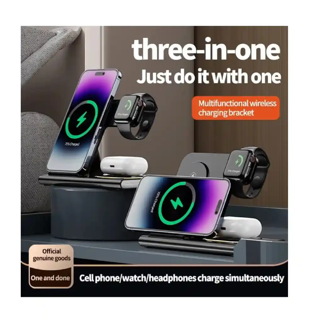 ÁNGULO DE SOPORTE AJUSTABLE Soporte metálico con magnetismo para ajustar el ángulo de soporte según tus necesidades, y es plegable ORGANIZADOR ESPACIOS/FACIL DE CARGAR Ahorra espacio que puedes usar para tu hogar, oficina o viaje, simplemente ponlo en tu bolso y llévalo a cualquier parte. Ya no te preocupes sobre los diversos cables de carga en tu vida, haciendo que tu escritorio esté limpio y ordenado Carga Inalámbrica para Celular y Reloj * COMPATIBILIDAD IPhone 14/14Pro/13/13 Pro/12/SE/11/11 Pro/11 Pro max/X/Xs/Xs Max/8/8 Plus, Samsung S20/S20+/S20 Ultra/S10/S10+/S10e/S9+/S8/S8+/S7/S7e, Note10/10/10/10/10. 0 +/9/9/9 +/8/8+, Pixel 3/3+/4/4+, etc. Y es compatible con Apple Watch 5/4/3/2/1, Conexión Lightning 8 pines audífonos, y conexión apple pen CARACTERÍSTICAS TÉCNICAS Modelo: W30 Input: 5V/2A9V/2A Output Reloj: 2W Output Apple Pencil:2W Output Audífonos: 5W Output Celular: 5W - 7.5 w - 10 W RECOMENDACIONES Se recomienda un adaptador de corriente QC 2.0 / 3.0 de alta calidad (9V / 2A) u otro adaptador de soporte de 10W para una carga rápida. Es posible que el uso de un adaptador de 5 V / 1 A no cargue su teléfono o reloj. (Adaptador no incluido) CONTENIDO DEL PAQUETE: El paquete incluye una estación de carga inalámbrica 4 en 1 Un cable de alimentación tipo C Guía de usuario