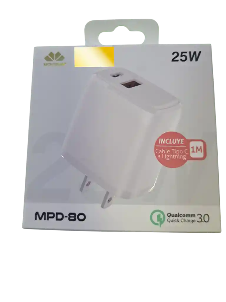 Cargador con cable C/Lightninig de 25W, dos puertos de carga USB y tipo C, Carga Rápida, PW/25W IOS, con tecnología Qualcomm QUICK CHARGE 3.0. Entrada: AC100-240V 50/30Hz 0.5A, Salida: USB A (QC3.0): DC5V-3A; 9V-2.22A; 12V-1.5A, Tipo C: 5V-3A; 9V-2.22A;12V-1.67A Ideal para todos los modelos de IPhone con puerto de carga Lightninig.