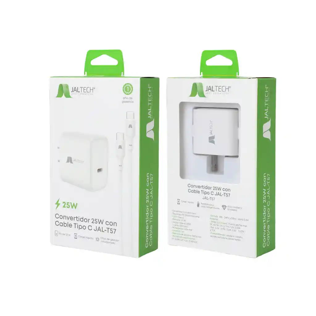 CARACTERISTICAS · Convertidor con cable tipo c · Tecnología PD (Power Delivery) · Color: blanco · Potencia: 25W · Incluye cable de 60W · 1 salida USB tipo C · Material del cable: PVC · Longitud: 1m · Diámetro de alambre: Od3,8 mm · Alambre de cobre interior: 55/0.08x2C +16/0.08x3C · Entrada: 100 – 240V a 50hz / 60Hz 0.6A (máximo) · Salidas: Salida única tipo C: Puerto pd25w max: DC 5V 3A / 9V 2.77A /12V 2.10A · Pps: 3.3V – 5.9V / 3.0A, 3.3V – 11.0V / 2.75A · Compatible con: celulares, tablets, laptops, auriculares, power banks.