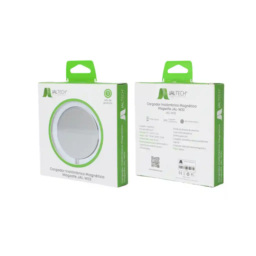 CARACTERISTICAS · Cargador magnético · Interfaz USB tipo C · Entrada: 5v / 2A 9V / 2A · Salida: 5w / 7.5w / 10w / 15w · Distancia de carga: 5 mm · Material del producto: base metálica + superficie de aceite de caucho · Ultra delgado · Fondo de aleación de aluminio · Luces LED indicadoras · Diseño gama alta · Cargador inalámbrico para smartphones bajo QI · Carga por inducción electromagnética · Color: blanco