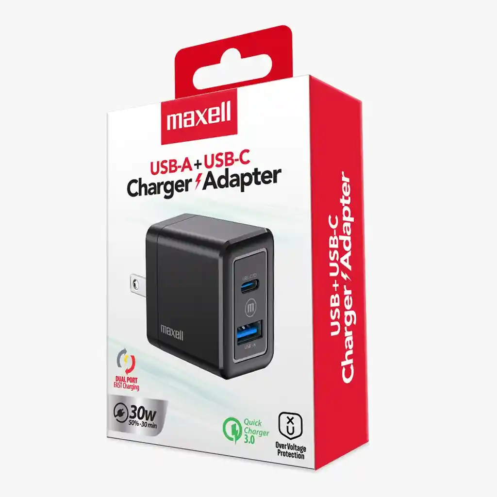 Potencia tu día con el cargador Maxell USB-A + USB-C de 30W, ideal para cargar dos dispositivos al mismo tiempo con velocidad y seguridad. Su tecnología GaN garantiza un rendimiento eficiente y temperatura fresca, mientras su diseño compacto y conector plegable lo hacen perfecto para llevar a todas partes. Compatible con Android, iOS, Windows y Mac, incluye protección activa contra sobrecargas para una carga confiable. Disfruta de una experiencia de carga optimizada gracias a su potencia inteligente y soporte para Quick Charge 3.0. ¡Lleva energía máxima en un tamaño mínimo! DESCRIPCION DEL PRODUCTO • 30W de potencia total de salida – Ideal para cargar laptops, tablets y smartphones rápidamente. • Puertos USB-A y USB-C – Permite cargar dos dispositivos al mismo tiempo. • Conector plegable – Facilita su almacenamiento y transporte. • Diseño compacto y portátil – Perfecto para llevarlo en viajes o en la oficina. • Protección activa contra sobrecarga – Mayor seguridad para tus dispositivos. • Temperatura de operación fría – Evita el sobrecalentamiento durante la carga. • Sistema de carga eficiente con tecnología GaN – Carga más rápida y con menor pérdida de energía. • Compatible con Android, iOS, Windows y Mac – Carga versátil para múltiples plataformas. • Soporta Quick Charge 3.0 – Carga hasta 2 veces más rápido que un cargador convencional. • Tecnología Smart IC Power Detection – Detecta el dispositivo conectado para una carga óptima.