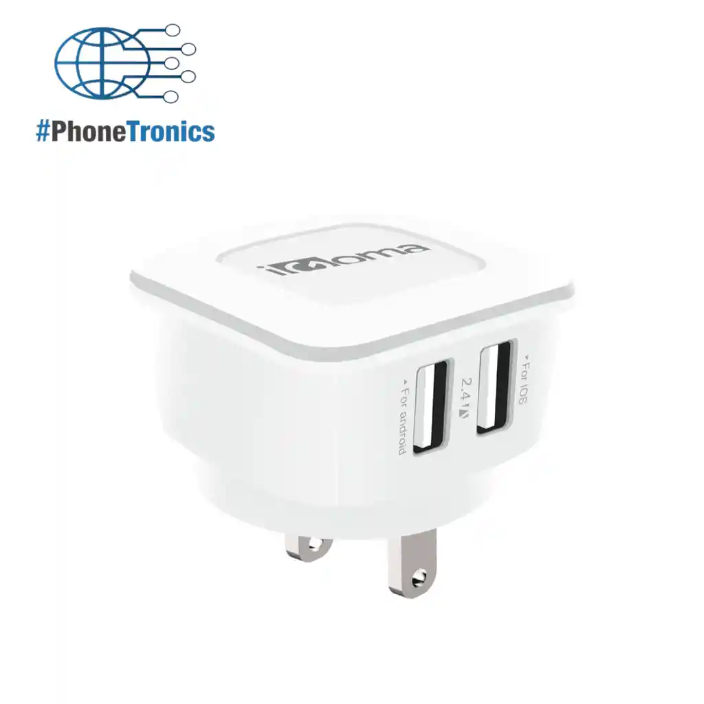 Función carga rápida y baja temperatura Cuenta con dos puertos usb de salida por lo que puedes recargar dos dispositivos al tiempo Flujo de corriente constante y seguridad de sobre carga. Material anti fuego. Ideal para viajes y entrenamientos largos. Especificaciones: Input: AC 110V-240V-50-60Hz Output: DC 5V-2.4 A Referencias disponibles: Tipo C, Micro, Iphone Color: blanco