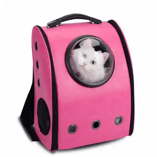 Cargador morral con capsula transparente para gatos y perros pequeños Incluye cápsula transparente y malla plástica para intercambiar de acuerdo a sus necesidades. Disponible en fucsia y rosado. Soporta hasta 12 kilos.Tamaño: 38 cms de alto x 33 cms de ancho x 23 cms de fondo. material: cuero sintetico.