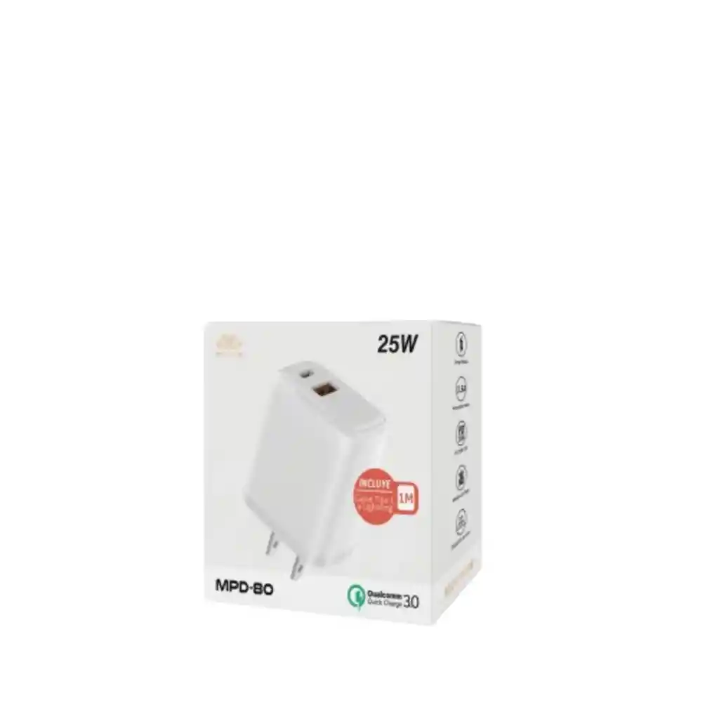 Cargador Movisun MPD-80 CC 25W Carga Rápida 3.5A iPhone Samsung Descripción del Producto El cargador Movisun MPD-80 es la solución ideal para quienes buscan una carga eficiente y segura sin complicaciones. Con una potencia de 25W y tecnología Qualcomm Quick Charge 3.0, este adaptador está diseñado para proporcionar una carga rápida y estable a una amplia variedad de dispositivos móviles. Características Principales: Potencia de 25W: Ideal para carga rápida diaria en smartphones de última generación. Tecnología Qualcomm Quick Charge 3.0: Garantiza una carga turbo optimizada y eficiente. Amperaje de 3.5A: Proporciona un flujo de corriente potente para reducir los tiempos de espera. Carga Dual Práctica: Cuenta con 1 salida USB, permitiendo versatilidad según el cable que elijas usar. Seguridad Avanzada: Equipado con protecciones contra sobrecargas y cortocircuitos bajo el sello de Calidad Original. Compatibilidad Garantizada: iPhone: Compatible con carga rápida para modelos iOS (PD 25W). Android: Perfecto para dispositivos Samsung, Xiaomi y otros equipos que soporten carga rápida de 25W.