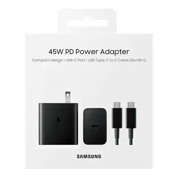 Cargador Original Samsung Súper Rápido 45w con cable USB C Samsung Cargador 45watts Para Galaxy A53 A13 A33 A23 A73 Un accesorio esencial para tu dispositivo. Diseñado para ofrecer la máxima protección y estilo. Fabricado con materiales de alta calidad para asegurar durabilidad y resistencia. Ideal para usuarios que buscan funcionalidad y elegancia. Marca: Samsung Modelo: EPT4510XBEGCA Nombre: 45W PD Power Adapter With USBC Cable (5 A ) 1.8 m / 5.9 ft (Versión 2022) Año de fabricación: 2022 Lugar de fabricación: Vietnam Lugar de empaque/supervisión: Vietnam Tecnología de carga rápida empleada: USB Power Delivery's Programmable Power Supply (PPS) Potencia máxima: 45W* Tipo de producto: Adaptador de corriente (Cubo + cable) Tipo de tomacorriente: Tipo A (planos) Clavijas o dientes planos para Perú y USA Color del cubo cargador: Negro Interfaz: USB tipo C Voltaje de entrada: 100 240V AC 5060Hz Voltaje de salida (carga normal): 5V Voltaje de salida (carga rápida): PDO : 9V, 15V, 20V / PPS : 3.311.0V o 3.316.0V or 3.321.0V Corriente de salida (carga rápida): PDO : 3A(9V, 15V), 2.25A(20V) / PPS : 4.05A(3.311.0V) or 2.8A(3.316.0V) o 2.1A(3.321. Corriente de salida (carga normal): 3A Dimensiones: 53.1 x 30.1 x 89.3 mm Tipo de cable de datos: USB 3.1 tipoC a tipoC (5 A) Longitud del cable: 1.8 m / 5.9 ft Color del cable: Negro Soporte máximo del cable: 5 Amperios Peso total: 92 g Estos smartphones cargarán en modo Súper Fast Charging 2.0 45W: Galaxy Note 10+, Galaxy Note 20 Ultra, Galaxy S20 Ultra, Galaxy S21 Ultra, Galaxy S22 Ultra, Galaxy Tab S7+, Galaxy Tab S8 Plus, Galaxy Tab S8 Ultra, Galaxy A91 y futuros dispositivos compatibles. Estos smartphones cargarán en modo Super Fast Charging 25W: Galaxy S21, Galaxy S21 Plus, Galaxy S21 Ultra, Galaxy Note 20, Galaxy Note 20 Ultra, Galaxy S20 FE Fan Edition, Galaxy Note 10 Plus, Galaxy Note 10 Plus 5G, Galaxy Note 10, Galaxy Note 10 5G, Galaxy Note 10 Lite, Galaxy S10 Lite, Galaxy S10 5G, Galaxy A90 5G, Galaxy A80, Galaxy A70, Galaxy A71, Galaxy A70, Galaxy A91, Galaxy S20 Ultra, Galaxy S20, Galaxy S20 Plus, Galaxy Tab S7, Galaxy Tab S7 Plus, Galaxy Tab S6, Galaxy Tab S6 Lite, Galaxy Tab S5e, Galaxy Tab S4, Galaxy Tab S3, Galaxy Book S, Galaxy A33 5G, Galaxy A13 4G/5G, Galaxy A73, Galaxy A53 5G, Galaxy A71, Galaxy A72, Galaxy A52, Galaxy A52s, Galaxy A51, Galaxy A22, Galaxy A21s, Galaxy A21, Galaxy A32, Galaxy A31, iPhone 12, iPhone 12 Mini, iPhone 12 Pro, iPhone 12 Pro Max, iPhone 13, iPhone 13 Mini, iPhone 13 Pro, iPhone 13 Pro Max, Galaxy S21 FE Fan Edition, Galaxy Z Fold2, Galaxy Z Fold3, Galaxy Z Flip2, Galaxy Z Flip3, Galaxy S22, Galaxy S22+ Plus, Galaxy S22 Ultra, Galaxy Tab S8 Plus, Galaxy Tab S8 Ultra, Galaxy Tab S8. Estos smartphones cargarán en modo Fast Charging 15W: Galaxy Note9, Galaxy S10, Galaxy S10+, Galaxy S10E, Galaxy S9, Galaxy S9+, Galaxy S8, Galaxy S8+, Galaxy S8 Active, Galaxy Note8, Galaxy A30, Galaxy A30, Galaxy A31, Galaxy A20, Galaxy A20S, Galaxy A21, Galaxy A50, Galaxy A50S, Galaxy A51, Galaxy A11, Galaxy M31. Compatibilidad de carga en modo normal para cualquier dispositivo con interfaz Usb Tipo C. Contenido de la caja: 01 cubo cargador, 01 cable USBC a USBC (5 A), guía de inicio. ¡Haz tu compra hoy y protege tu inversión!