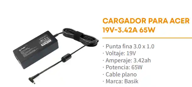· Punta fina 3.0 x 1.0 · Voltaje: 19V · Amperaje: 3.42ah · Potencia: 65W · Cable plano EXPOTECNOLOGIA 3505945136