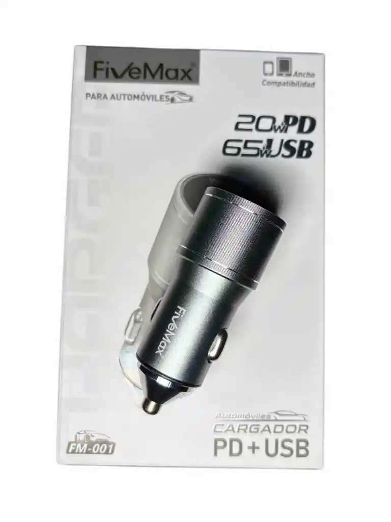 Este es un cargador para automóvil marca FiveMax. Tiene dos puertos, uno USB y otro Tipo C, y puede cargar dispositivos de forma rápida. Funciona conectándolo al encendedor del automóvil. Entrada: 12-24V Salida usb: 5V/3A 10V/6.5A (65W) Salida usb C: 5V/3A 9V/2.22A 12V/1.67A (20W) No incluye cable de carga. Material: Metalico