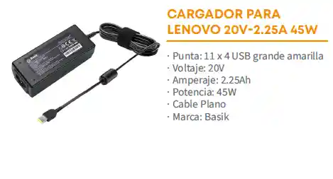 · Punta: 11 x 4 USB grande amarilla · Voltaje: 20V · Amperaje: 2.25Ah · Potencia: 45W · Cable Plano · Marca: Basik EXPOTECNOLOGIA 3505945136