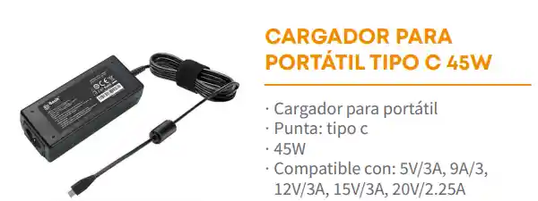 Cargador para portátil · Punta: tipo c · 45W · Compatible con: 5V/3A, 9A/3, 12V/3A, 15V/3A, 20V/2.25A EXPOTECNOLOGIA 3505945136