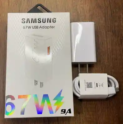 adaptador de corriente USB Samsung de 67W. Proporciona carga ultrarrápida de 67W para dispositivos compatibles. Cuenta con un puerto USB Tipo C. Incluye un cable USB-C a USB-C. Diseño compacto y ligero, ideal para transportar.