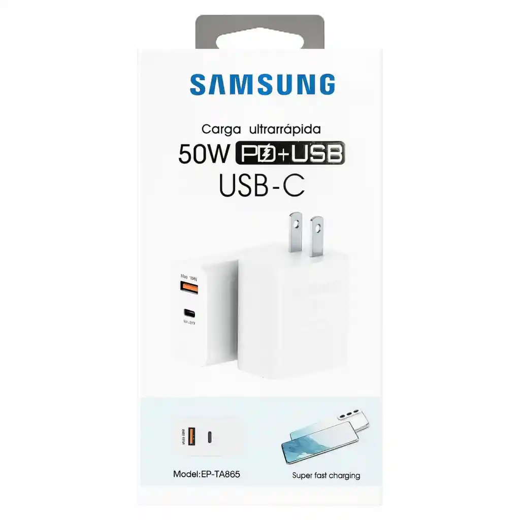 El cargador Samsung Galaxy S22 de 50W ofrece una carga ultrarrápida y segura, ideal para mantener tus dispositivos siempre listos. Su diseño compacto incluye doble puerto PD+USB, permitiendo cargar simultáneamente dos equipos. Potencia total: 50W Puertos: USB-C y USB-A Tecnología PD (Power Delivery) para una carga inteligente y eficiente Compatibilidad: dispositivos Samsung, Android, iPhone y otros equipos con conexión USB-C Incluye cable USB-C de alta resistencia Modelo: 7A ⚡ Perfecto para quienes buscan velocidad, seguridad y eficiencia en un solo adaptador. (El diseño del empaque puede variar según disponibilidad).