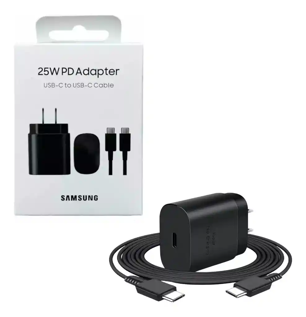 Función de carga súper rápida para un estilo de vida rápido. Tus dispositivos lo merecen. Descubra un adaptador de carga con función de carga súper rápida (25 W) y recargue sus dispositivos compatibles en un instante. Para obtener resultados de carga impresionantes, use el cable de carga Samsung Tipo-C a Tipo-C. Incluido El adaptador de carga también se puede utilizar para dispositivos sin tecnología de carga rápida. Para dispositivos que admiten PD 3.0 estándar, el adaptador de carga puede alcanzar una velocidad de hasta 25 W. Para otros dispositivos, alcanza la velocidad normal. Características del producto: – Sistema de protección múltiple: el cargador PD de 25 W detiene automáticamente la carga cuando la energía está llena, lo que puede proteger al máximo tu dispositivo de sobrecarga durante toda la noche. -Ultradurabilidad: el cable está hecho de cobre puro y cubierto por plástico ABS blanco que garantiza la seguridad del dispositivo durante la carga, específicamente diseñado para equipos de carga rápida. – Salida máxima de 25 W/ 9 V/ 2,77 A, voltaje de funcionamiento 100-240 V, se adapta a diferentes países estándar. – Rango de voltaje del cargador: 100 ~ 240 V 50/60 Hz 0,5 A. Listo para viajar en todo el mundo. Incluye: -Cargador Samsung Carga Rápida Power Delivery 25W -Cable Samsung USB Tipo C a USB Tipo C