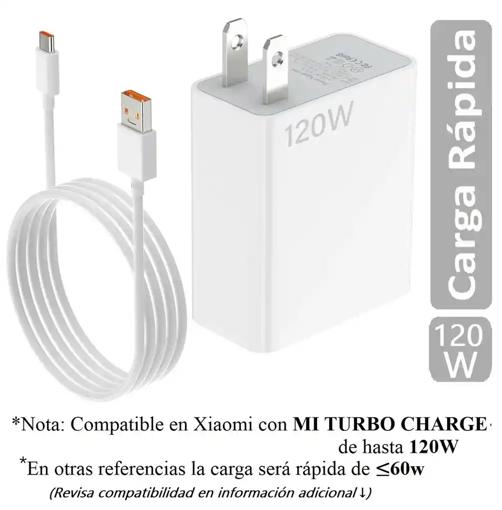 Cargador Tipo C Carga rápida 120W turbo ● Marca: Genérico ● Incluye: Cargador completo + cable de datos usb A a tipo C ● TOTAL POWER: 120W (MAX) ● Compatibles con: Celular Android Samsung Xiaomi Motorola MacBook Huawei