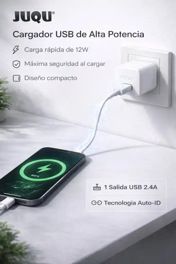 ¡Conecta y carga sin esperar! Cargador JUQU 12W con salida 2.4A que brinda carga rápida, estable y segura en un diseño compacto. Ideal para llevar a todas partes. 💡 Puntos clave 🔌 1 salida USB 2.4A ⚡ Carga rápida 12W 🛡️ Protección contra sobrecarga y cortocircuito 📱 Compatible con múltiples dispositivos 🎒 Diseño compacto y portátil