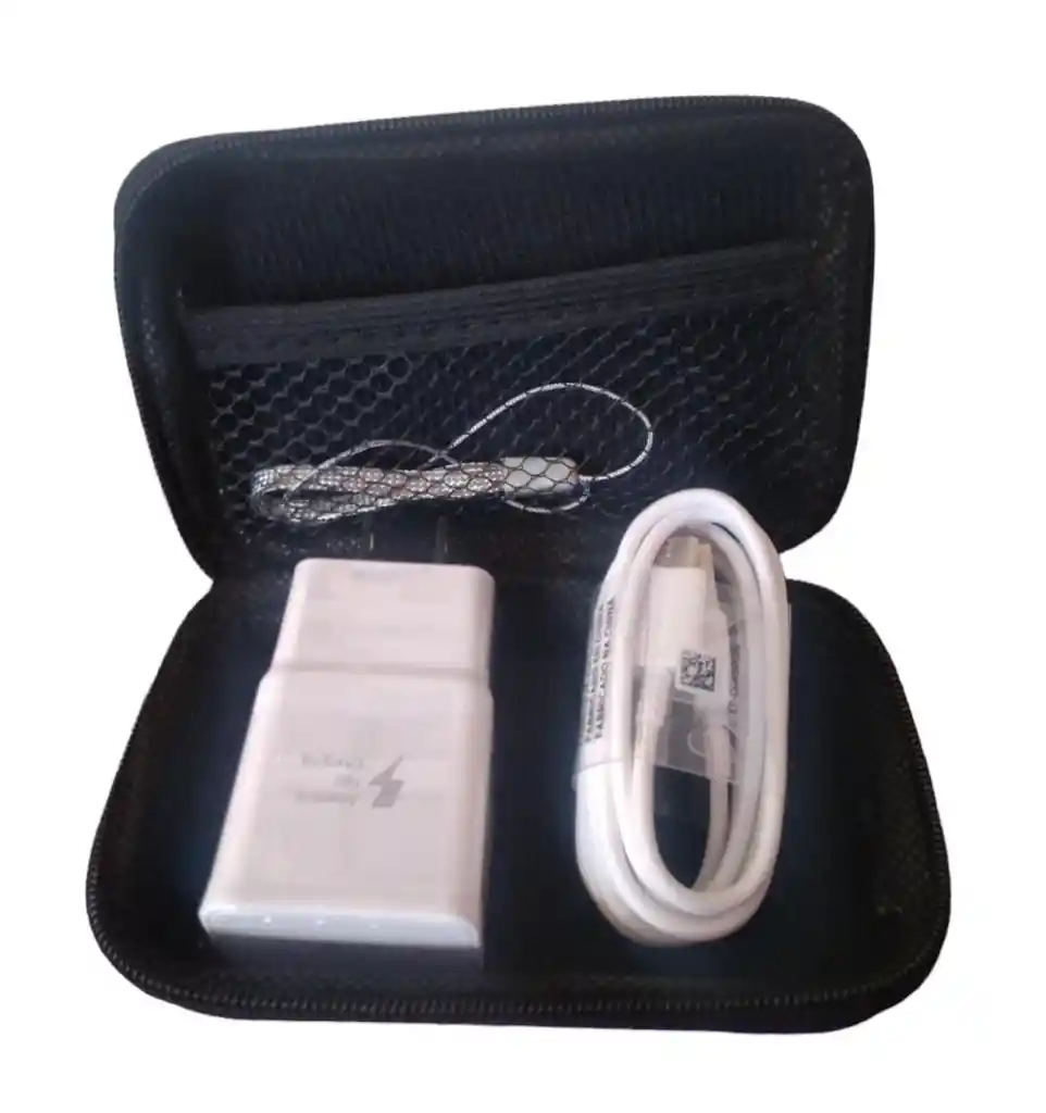 cargador compatible con puerto tipo c, en estuche, super practico para llevar, guardar y proteger el cargador. carga rápida. disponible en color blanco